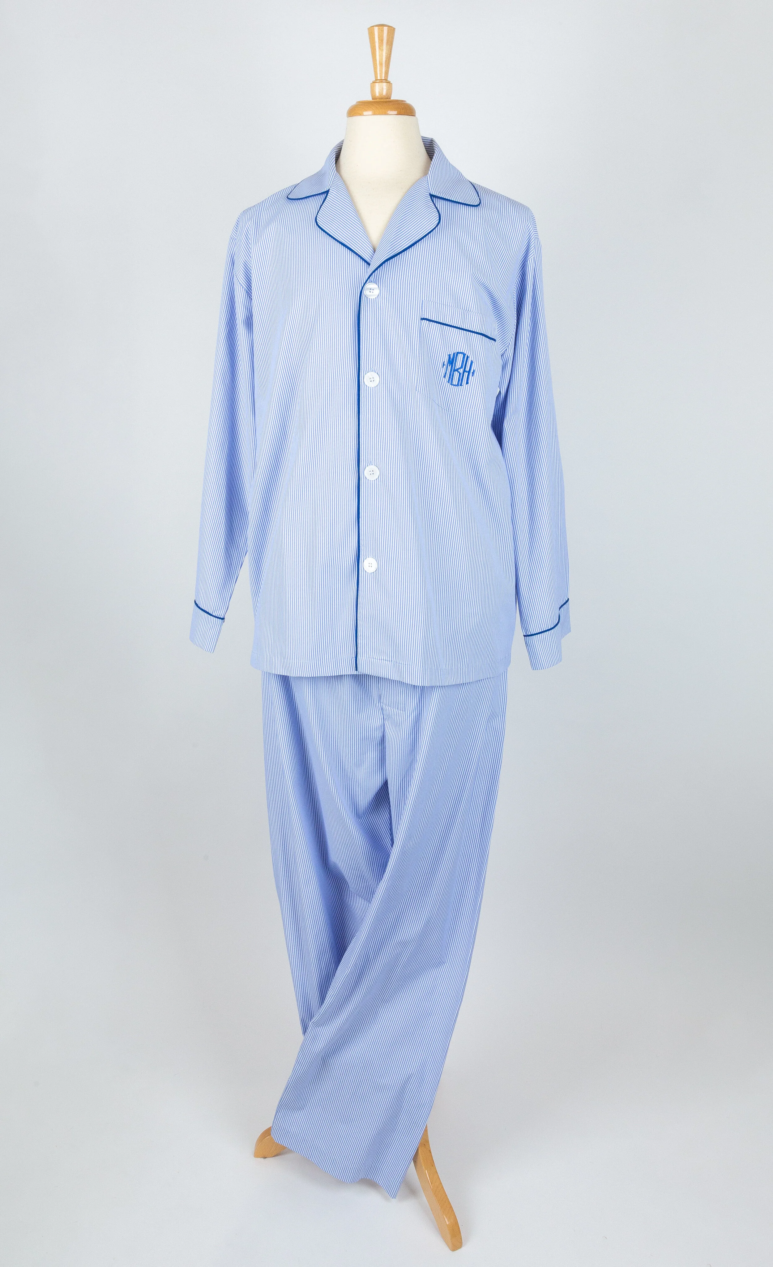 Men’s classic blue pinstripe PJ set with Freeman monogram