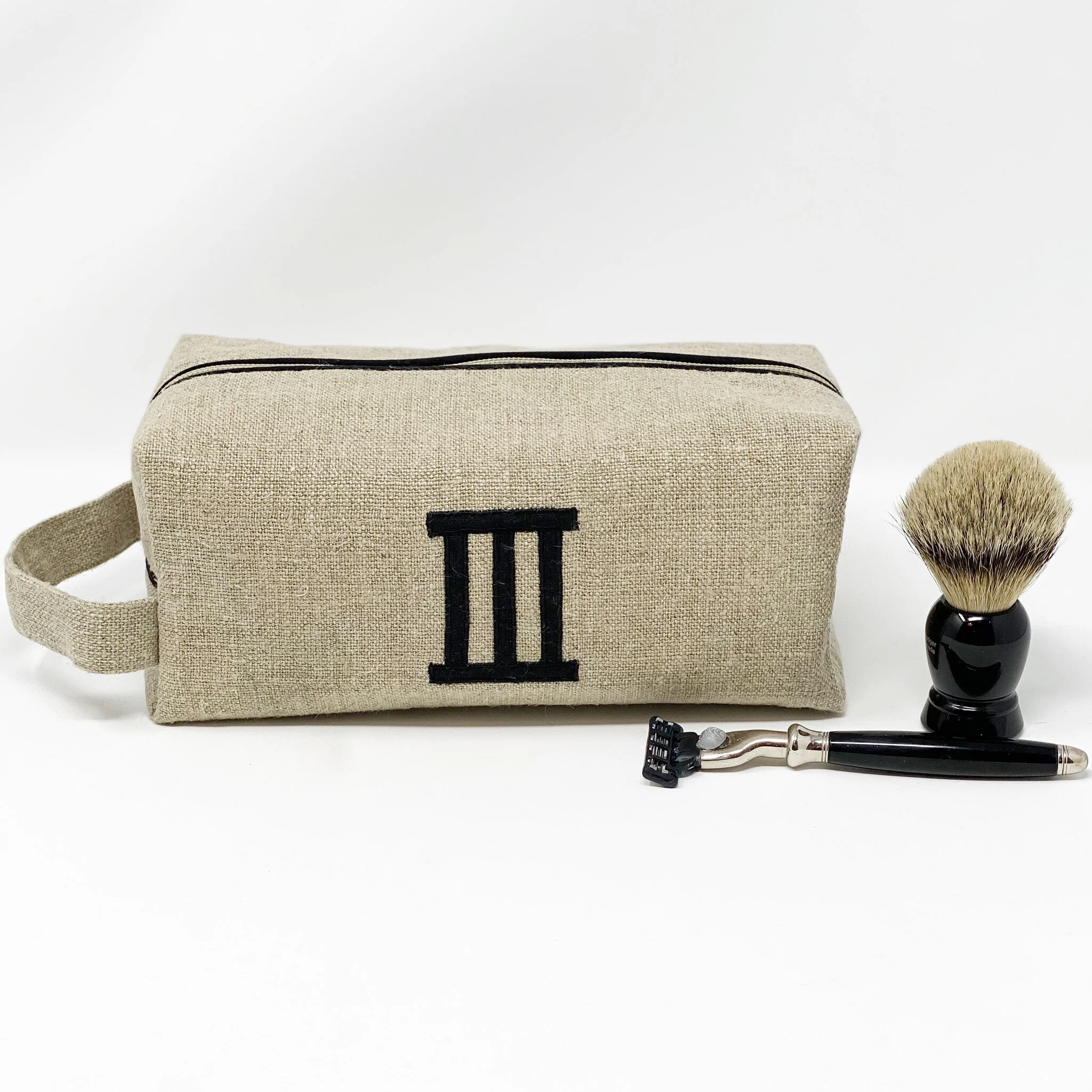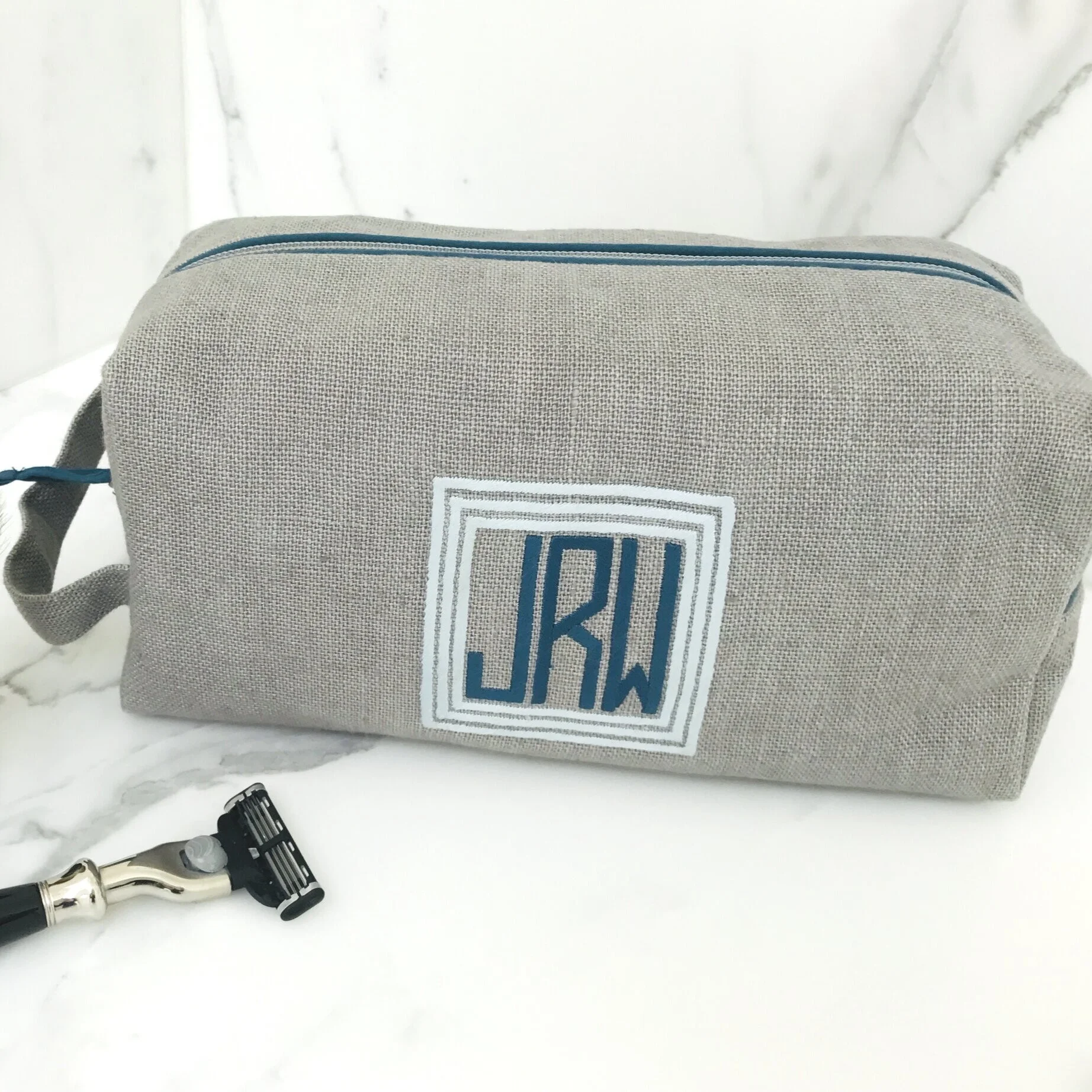 Men’s Dopp kit in natural textured linen with Appliqué monogram